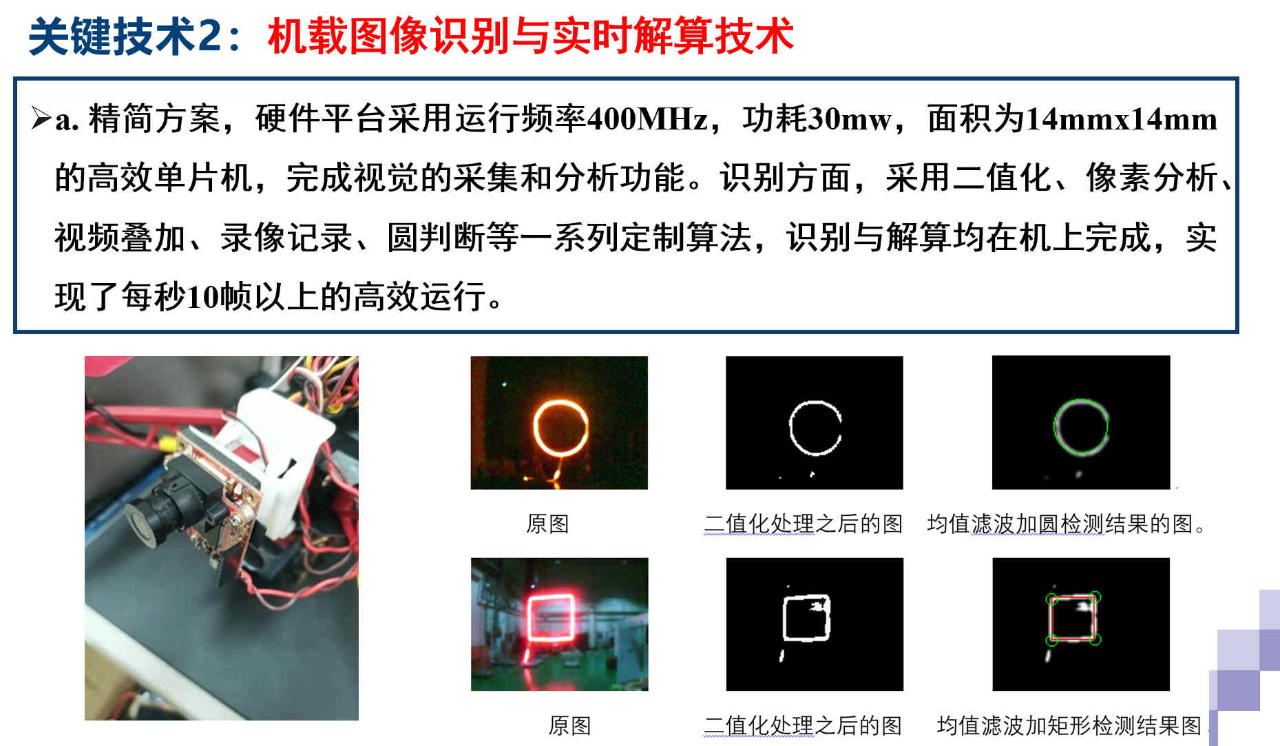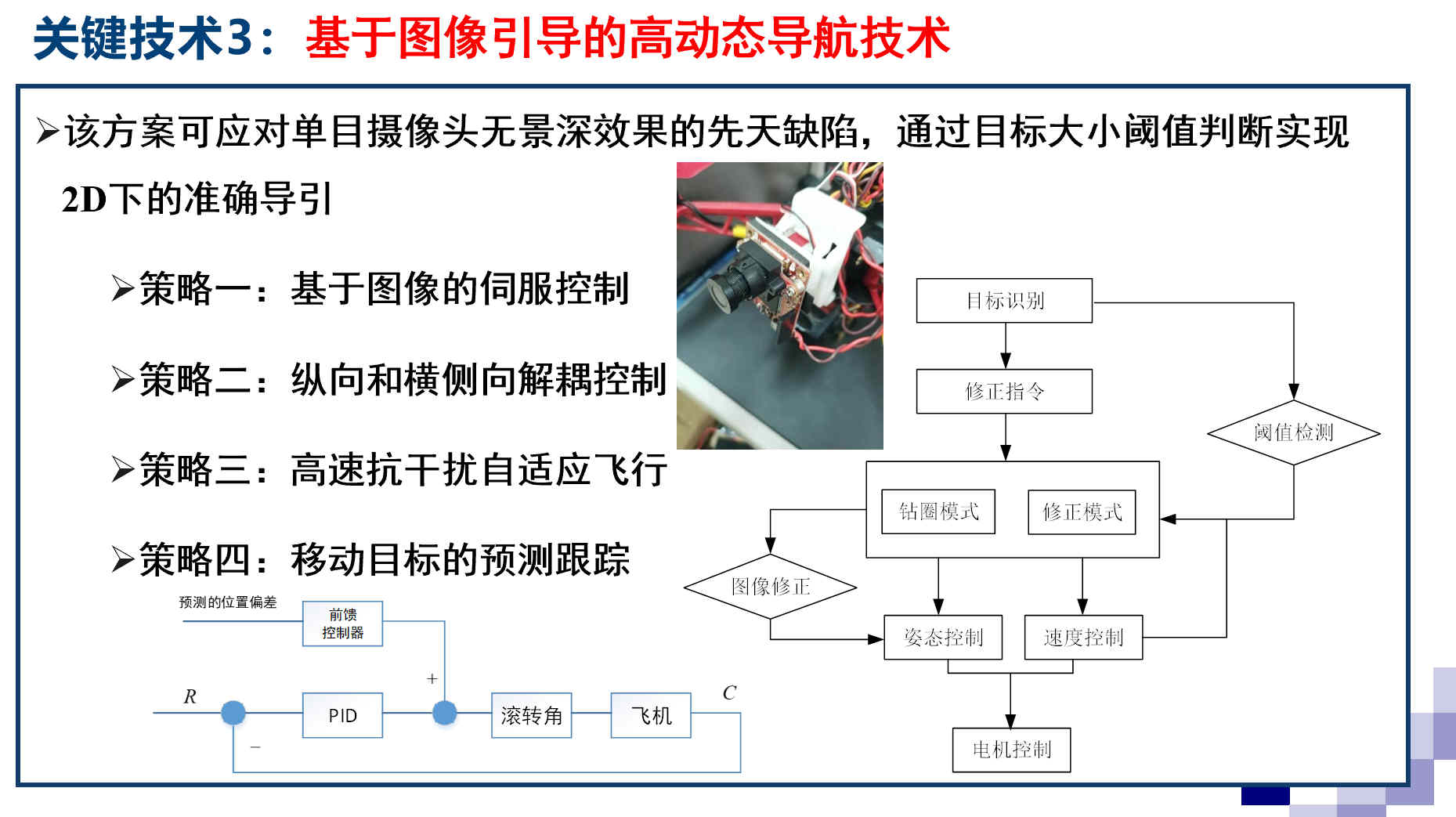Note:在拒止环境下,微型无人机采用自主视觉导航,实现高速穿越移动靶标。技术难点与挑战:1.无GPS信息,自身定位困难;2.高动态目标的识别;3自主高速穿越飞行;4.微型化。