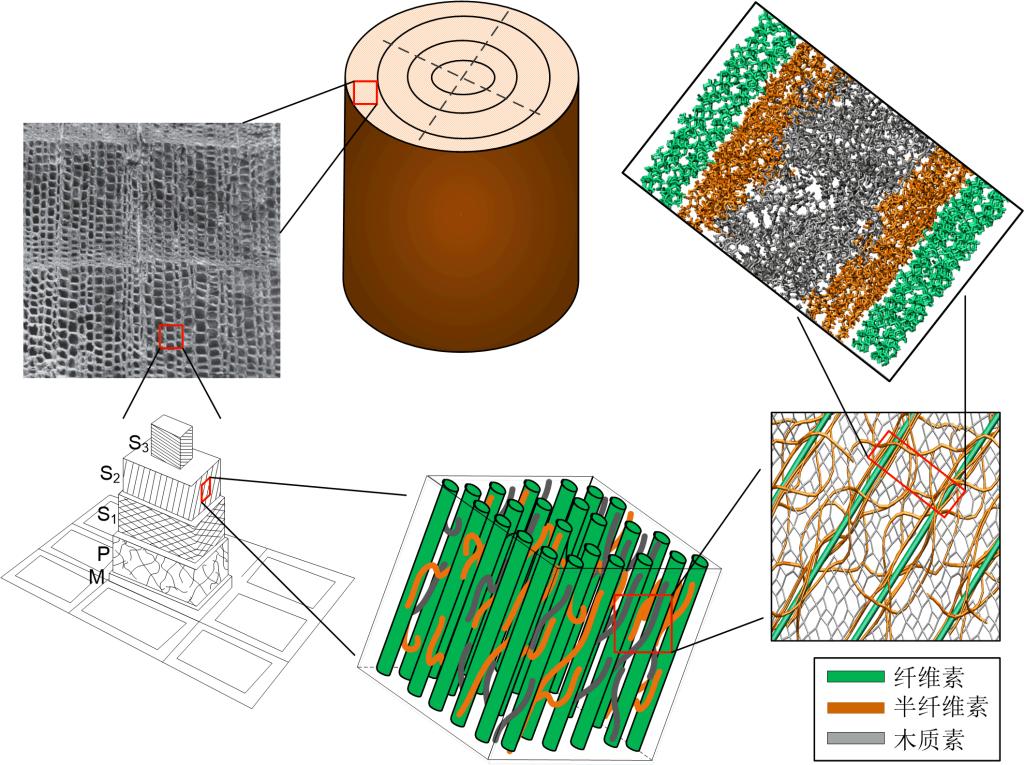植物材料的多层级结构及其在不同层级尺度的优越力学性能使其成为仿生工程中优良的研究对象,设计具有不同特性的结构材料。由于细胞壁为主要承载结构,深入了解细胞壁微观结构与其性能之间的相互作用是未来制造性能可控材料的核心。运用分子动力学方法,我们在微观尺度研究了竹材细胞壁中聚合物组分的粘弹性能和力学性能,以及发现了细胞壁组分的力学性能及其相互作用决定了细胞壁结构的力学性能。本课题为组装/设计结构及其基本组分、制造具有特定性能的仿生材料提供重要基础。